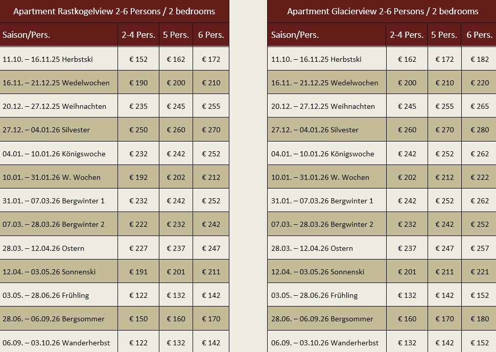 Pricelist Apartment 2-6 Persons / 2 Bedrooms