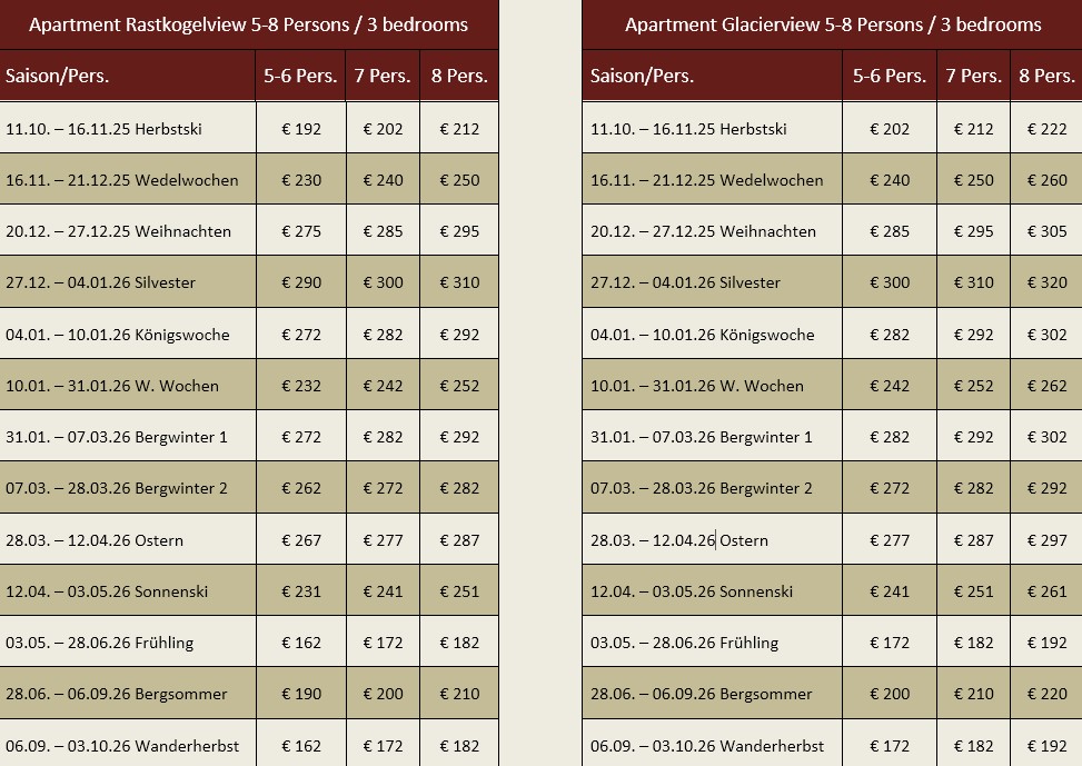 Pricelist Apartment 5-8 Persons / 3 Bedrooms
